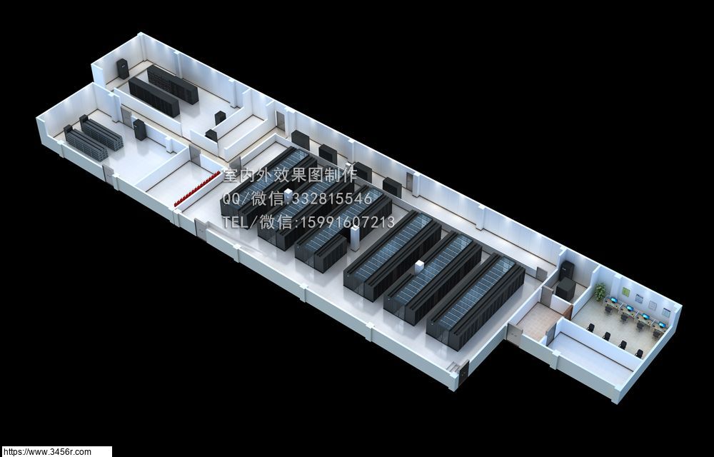 细节:某些模型的精度方面没有丰富的内在表现,机柜的衔接处,拐角处,机柜本身的运行效果表现没有表达出来。
