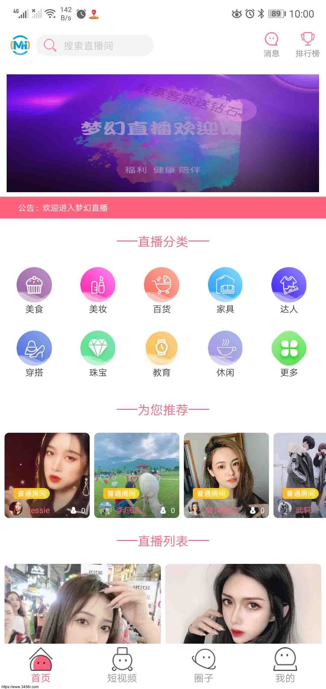 1、首页:搜索栏、消息界面、排行榜、轮播图、公告、直播分类、直播列表